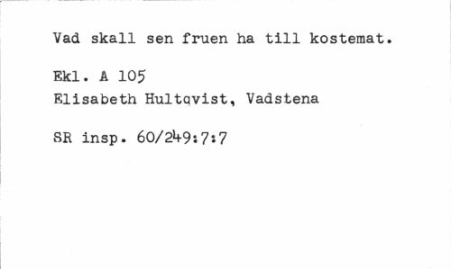 //// Vad skall sen fruen ha till kostemat. Ekl. A 105 //// Elisabeth Hultqvist, Vadstena SR insp. 60/2^9*7*7 ////