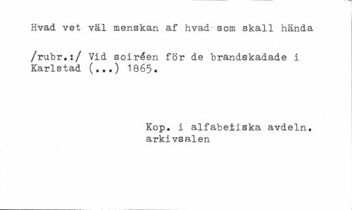 //// Hvad vet väl menskan af hvad som skall hända //// /rubr.:/ Vid soiréen för de brandskadade i Karlstad (...) 1865. //// Kop. i alfabetiska avdeln. arkivsalen ////