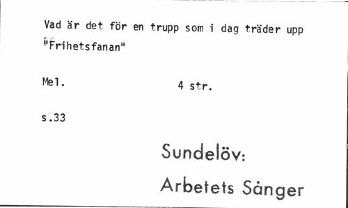 //// Vad ä'r det för en trupp som i dag träder upp "Frihetsfanan" //// Mel. 4 str. //// s .33 //// Sundelöv: Arbetets Sånger ////