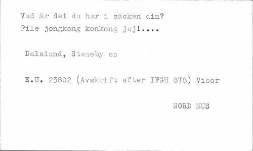 //// Vad är det du har i säcken din? File jongkong konkong jejl... //// Dalsland, Steneby sn //// E.U. 23802 (Avskrift efter IFGH 878) Visor //// NORD MUS ////