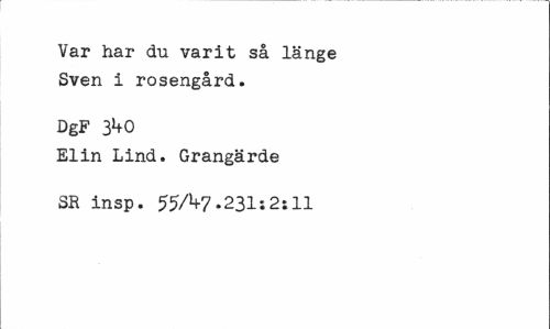 //// Var har du varit så länge Sven i rosengård. //// DgF 3^0 //// Elin Lind. Grangärde SR insp. 55/^7.231:2:11 ////