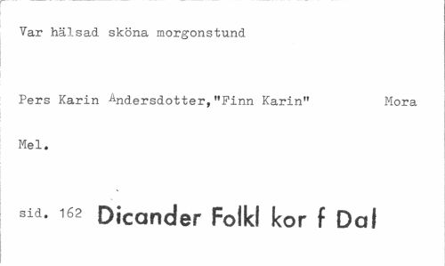 //// "Var hälsad sköna morgonstund //// Pers Karin Andersdotter,"Finn Karin" Mora //// Mel. //// sid. 162 Dicander Foikl kor f Dal ////