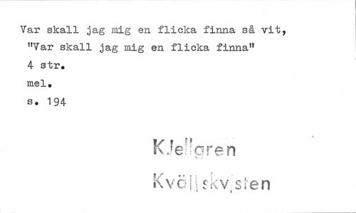 //// Var skall jag mig en flicka finna så vit, "Var skall jag mig en flicka finna" 4 str. mel, s. 194 //// K)é\arer\ //// V ¦/ //// Kvo 15kv Si en //// ? a e ////