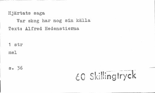 //// Hjärtats saga //// Var skog har nog sin källa Text: Alfred Hedenstierna //// 1 str mel //// s. 36 //// 60 Skillingtryck ////