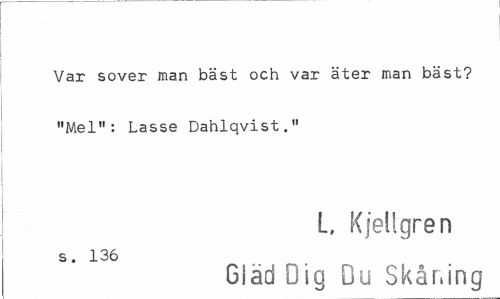//// Var sover man bäst och var äter man bäst? "Mel": Lasse Dahlqvist." //// L, Kjellgren //// s. 136 //// Gläd Dig Du Skåning ////