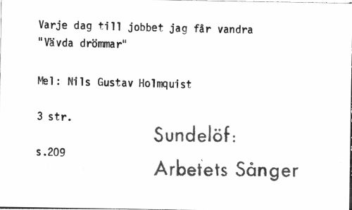 //// Varje dag till jobbet jag får vandra "Vävda drömmar" //// Mel: Nils Gustav Holmquist 3 str. //// Sundelöf: //// s .209 //// Arbetets Sånger ////