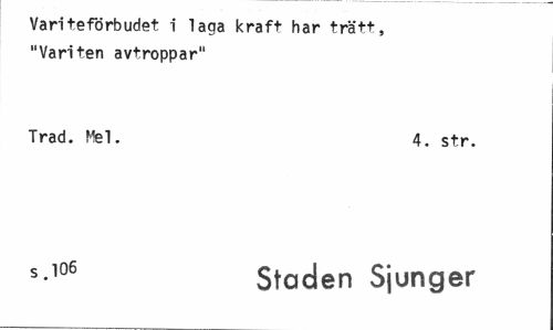 //// Variteförbudet i laga kraft har trätt, "Vari ten avtroppar" //// Trad. Mel. 4. str. //// Staden Sjunger ////