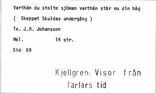 //// Varthän du stolte sjöman varthän står nu din håg //// ( Skeppet Skuldas undergång ) //// Tx. O.R. Johansson //// Mel. 14 str. //// Sid 89 //// Kjellgren: Visor f rån farlars tid ////