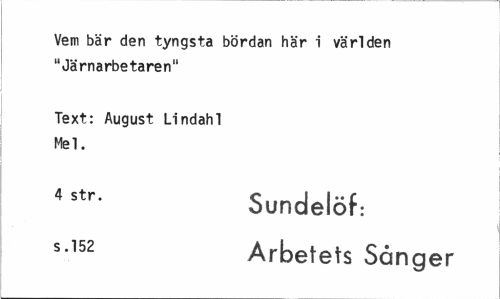 //// Vem bär den tyngsta bördan här i världen "Järnarbetaren" //// Text: August Lindahl Mel. //// 4 str' Sundelöf: //// 5,152 Arbetets Sånger ////