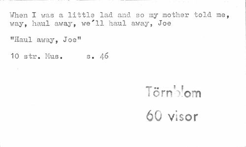 //// When I was a little lad and so my mother told me, way, haul away, we'll haul away, Joe //// "Haul away, Joe" //// 10 str. Hus. s. 46 //// T- 'i //// t orn xom 60 visor ////