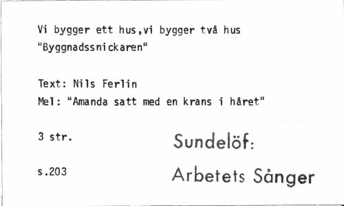 //// Vi bygger ett hus,vi bygger två hus "Byggnadssni ckaren" //// Text: Nils Ferlin //// Mel: "Amanda satt med en krans i håret" //// 3 str" Sundelöf: //// s-203 Arbetets Sånger ////