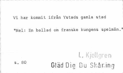 //// Vi har kommit ifrån Ystads gamla stad "Mel: En ballad om franske kungens spelmän. //// L, Kjellgren //// s' 80 Gläd Dig Du Skåning ////