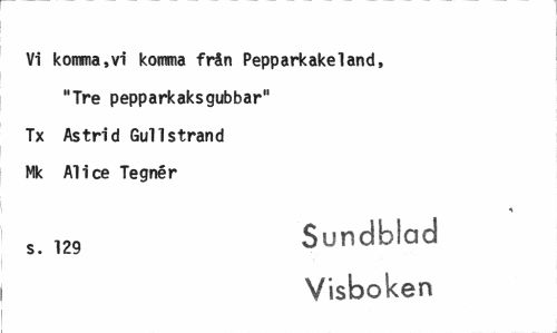 //// Vi komma,vi komma från Pepparkakeland, //// "Tre pepparkaksgubbar" Tx Astrid Gul!strand Mk Alice Tegnér //// 129 Sundblad //// Visboken ////
