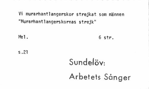 //// Vi murarhantlangerskor strejkat som männen "Murarhantlangerskornas strejk" //// Mel. 6 str. //// s .21 //// Sundeföv: Arbetets Sånger ////