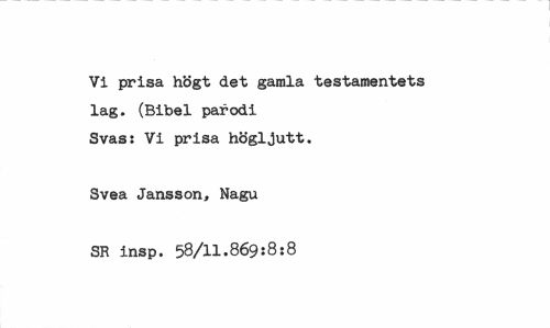//// Vi prisa högt det gamla testamentets lag. (Bibel parodi Svas: Vi prisa högljutt. //// Svea Jansson, Nagu //// SR insp. 58/11.869:8:8 ////