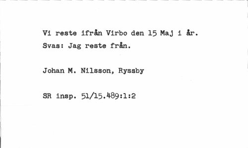 //// Vi reste ifrån Virbo den 15 Maj i år. Svas: Jag reste från. //// Johan M. Nilsson, Ryssby //// SR insp. 51/15.^89:1:2 ////