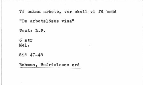 //// Vi sakna arbete, var skall vi få bröd //// "De arbetslöses visa" //// Texts l.P. //// 6 str Mel. //// Sid 47-48 //// Bohman, Befrielsens ord ////