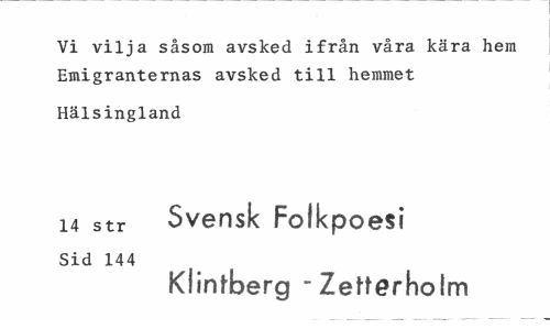 //// Vi vilja såsom avsked ifrån våra kära hem Emigranternas avsked till hemmet //// Hälsingland //// 14 str Svensk Folkpoesi //// Sid 144 //// Klintberg - Zetterholm ////