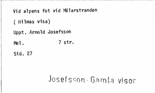 //// Vid alpens fot vid Mälarstranden //// ( Hilmas visa) //// Uppt. Arnold Josefsson //// Mel. 7 str. //// Sid. 27 //// Josefsson- G^mia visor ////