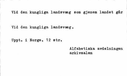 //// Vid den kungliga landsvaeg som gjenem landet går //// Yid den kungliga landsvaeg. Uppt. i Norge. 12 str. //// Alfabetiska avdelningen arkivsalen ////