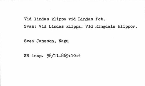 //// Vid lindas klippa vid Lindas fot. //// Svas: Vid Lindas klippa. Vid Ringdals klippor. //// Svea Jansson, Nagu //// SR insp. 58/11.869:10:4 ////