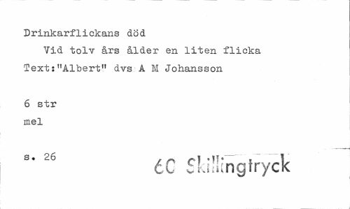 //// Drinkarflickans död //// Vid tolv års ålder en liten flicka Text:"Albert" dvs A M Johansson //// 6 str mel //// 3"26 éC Skiliingtryck ////