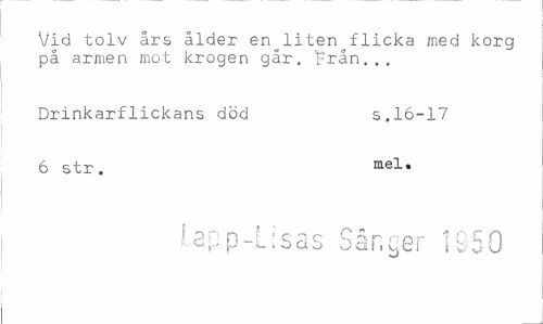 //// Vid tolv års ålder en^liten flicka med korg på armen mot krogen gar. "Från... //// Drinkarflickans död s.16-17 //// 6 str. mel* //// idp p -l . s a . 3nger i ? 5 0 ////