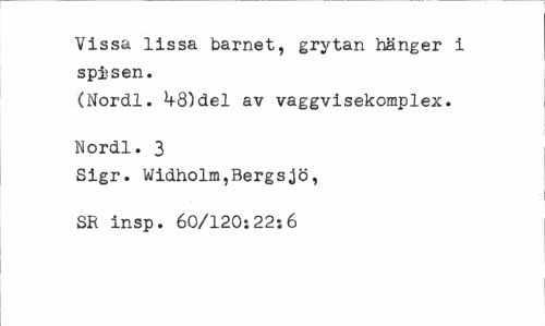 //// Vissa lissa barnet, grytan hänger i spisen. //// (Nordl. 1+8)del av vaggvisekomplex. Norell. 3 //// Sigr. Widholm,Bergsjö, SR insp. 60/120:22:6 ////