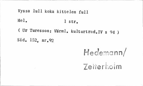 //// Vyssa lull koka kittelen full Mel. 1 str. //// ( Ur Turessonj Värml. kulturtrad.IV s 94 ) Sid. 152, nr.92 //// Hedemonn/ Zerterholm ////