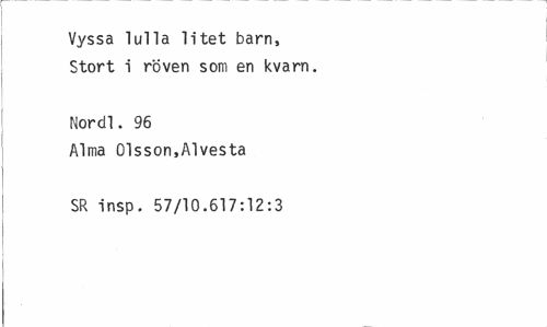 //// Vyssa Tulla litet barn, Stort i röven som en kvarn. //// Nordl. 96 //// Alma Olsson,Alvesta SR insp. 57/10.617:12:3 ////