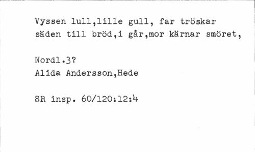 //// Vyssen lull,lille gull, far tröskar säden till bröd,i går,mor kärnar smöret, //// Nordl.3? //// Alida Andersson,Hede SR insp. 60/120i12tb ////