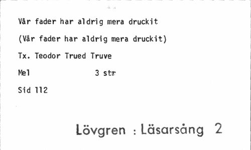 //// Vår fader har aldrig mera druckit (Vår fader har aldrig mera druckit) Tx. Teodor Trued Truve Mel 3 str //// Sid 112 //// Lövgren : Läsarsång 2 ////