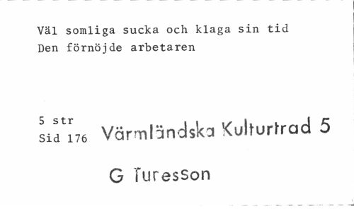 //// Väl somliga sucka och klaga sin tid Den förnöjde arbetaren //// sid^i76 Värmländska Kulturråd 5 G TuresSon ////