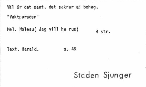 //// Väl är det sant, det saknar ej behag, "Vaktparaden" //// Mel. Moleau( Jag vill ha rus) 4 str //// Text. Harald. s. 46 //// Stcden Sjunger ////