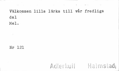 //// Välkommen lilla lärka till vår fredliga //// dal //// Mel. //// Nr 121 //// Adlerkull Halmstad* ////
