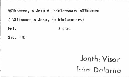 //// Välkommen, o Jesu du himlamonark välkommen ( Välkommen o Jesu, du himlamonark) Mel. 3 str. //// Sid. 110 //// Jonth: Visor //// frnn Dalarna ////