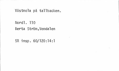 //// Västnola på tallbacken. //// Nordl. 110 //// Berta Ström,Vemdal en //// SR insp. 60/120:14:1 ////