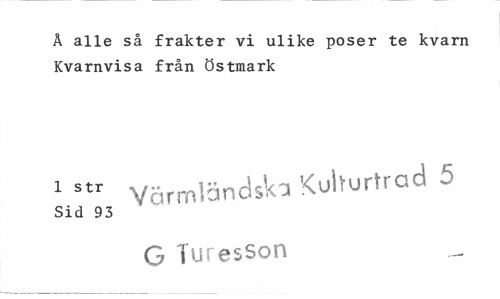 //// Å alle så frakter vi ulike poser te kvarn Kvarnvisa från Östmark //// 1 str Värmländska Kulturtrad 5 //// Sid 93 //// G iuresson ////