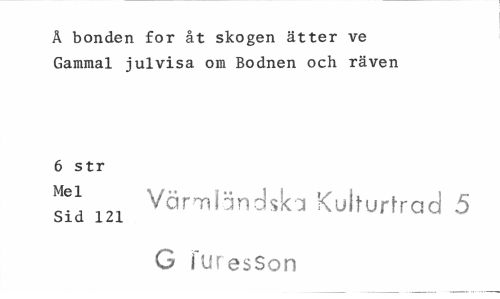 //// Å bonden for åt skogen ätter ve Gammal julvisa om Bodnen och räven //// 6 str //// 7-1 171 Värmländsks Kulturfrad 5 //// Sid 121 //// G furesSon ////