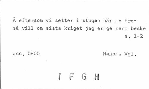 //// o //// A eftersom vi setter i stugan här me fre-så vill om sista kriget jag er ge rent beske //// s. 1-2 //// acc. 5805 Hajom, Vgl. //// I F G H ////