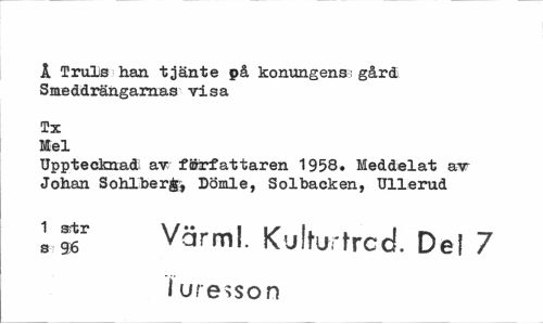 //// Å Trulis han tjänte på konungens; gård Smeddrängarnas visa //// Tx Mel //// Upptecknad av författaren 1958. Meddelat a-v Johan Sohlber&, Dömle, Solbacken, Ullerud //// 19T Värml. Kulhirtrcd. Del 7 i uresson ////
