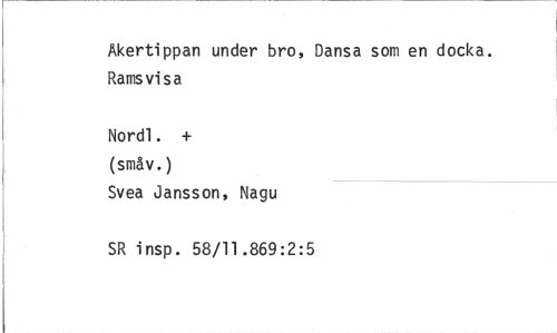 //// Äkertippan under bro, Dansa som en docka. Ramsvi sa //// Norell. + (småv.) //// Svea Jansson, Nagu SR insp. 58/11.869:2:5 ////