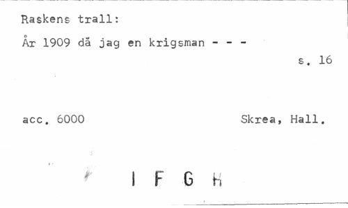 //// Raskens trall: //// År 1909 då jag en krigsman - - - //// s. 16 //// acc. 6000 Skrea, Hall. //// I F G H ////