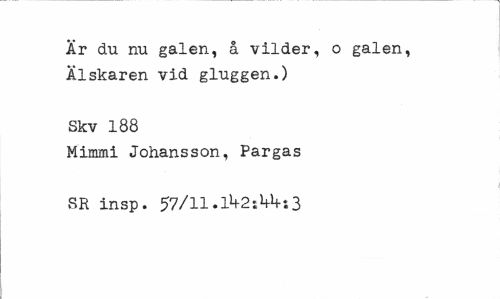 //// År du nu galen, å vilder, o galen, Älskaren vid gluggen.) //// Skv 188 //// Mimmi Johansson, Pargas SR insp. 57/11.1^2-.^:3 ////