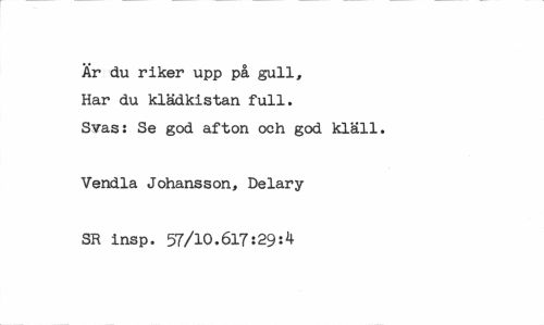 //// Ar du riker upp på gull. //// Har du klädkistan full. //// Svas: Se god afton och god kläll. //// Vendia Johansson, Delary //// SR insp. 57/10.617:29:4 ////