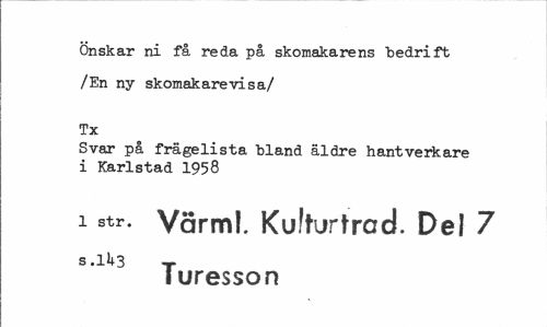 //// Önskar ni få reda på skomakarens bedrift /En ny skomakarevisa/ //// Tx //// Svar på frågelista bland äldre hantverkare i Karlstad 1958 //// i str. Värm!. Kulturtrad. Del 7 //// S.1U3 T //// Turesson ////