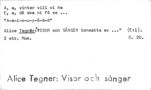 //// A, a, vinter vill vi ha E, e, då ska ni få se ... (E:1). S. 20. //// "A-e-i-o-u-y-å-ä-ö" //// Alice Teqnår:VISOR och SÅNGER tonsatta av 2 str. Mus. //// Alice Tegner: Visor oc.-I sånger ////