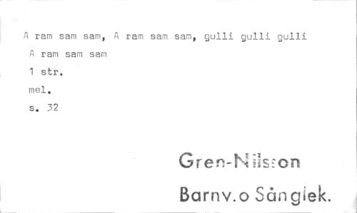 //// A ram sam sam, A ram sam sam, gulli gulli gulli //// A ram sam sam //// 1 str. //// mei. //// s. 32 //// Gren-IN isjon //// Barnv. o Sångek. ////