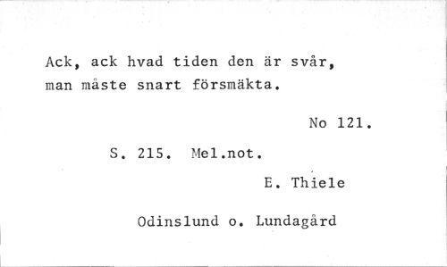 //// Ack, ack hvad tiden den är svår, man måste snart försmäkta. //// No 121. //// S. 215. Mel.not. //// E. Thiele //// Odinslund o. Lundagård ////