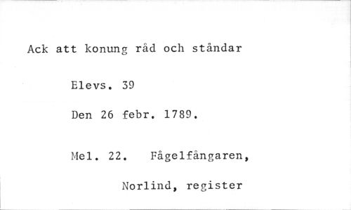 //// Ack att konung råd och ståndar //// Elevs. 39 //// Den 26 febr. 1789. //// Hel. 22. Fågelfångaren, //// Norlind, register ////